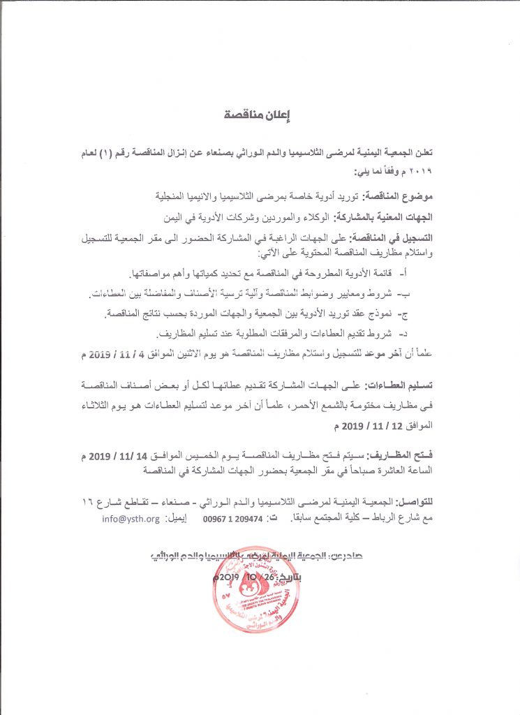 إعلان عن إنزال مناقصة رقم (1) لعام 2019م لتوريد أدوية خاصة بمرضى الثلاسيميا والأنيميا المنجلية تعلن الجمعية اليمنية لمرضى الثلاسيميا والدم الوراثي بصنعاء عن...