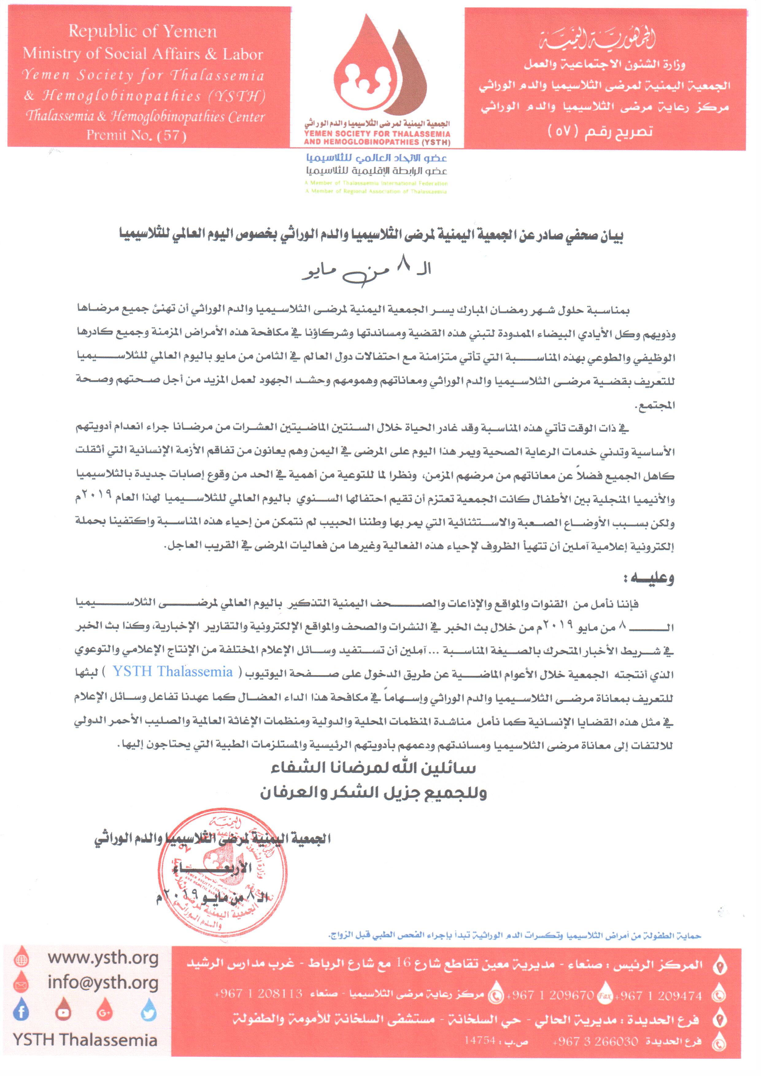 بيان صحفي صادر عن الجمعية اليمنية لمرضى الثلاسيميا والدم الوراثي بخصوص اليوم العالمي للثلاسيميا