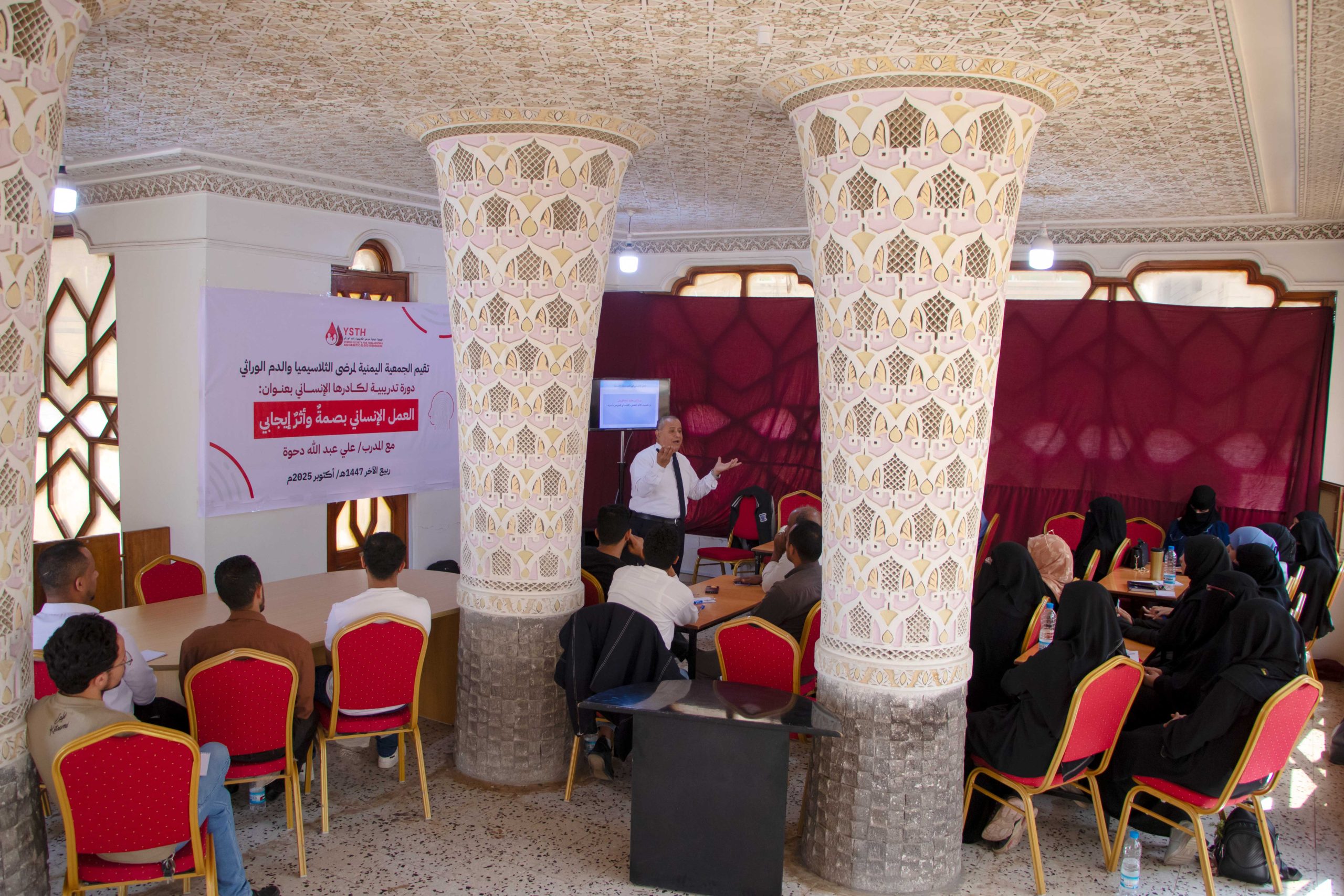 أقامت الجمعية اليمنية لمرضى الثلاسيميا والدم الوراثي اليوم الخميس 10 ربيع الآخر 1447هـ الموافق 2 أكتوبر 2025م دورة تدريبية لكادرها الإنساني بعنوان”العمل الإنساني.. بصمة وأثر إيجابي” بقيادة المدرب أ. علي عبد الله دحوة.