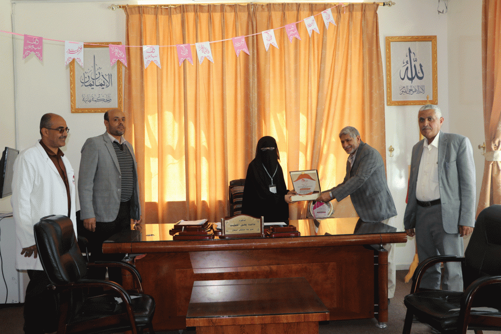 رئيس الجمعية د. أحمد شمسان المقرمي وعدد من أعضاء الهيئة الإدارية يكرمون قيادة مستشفى السبعين للأمومة والطفولة، ممثلاً بمدير المستشفى د. ماجدة يحي الخطيب؛...