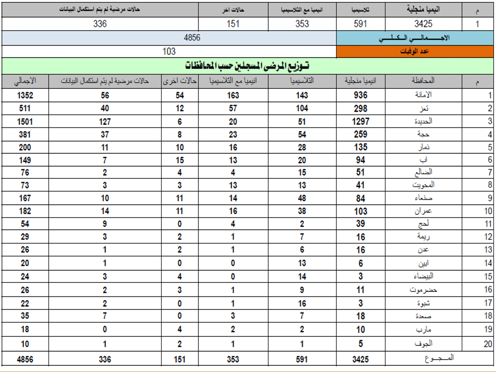 28 أكتوبر الإحصائيات Read more احصائية مركز الثلاسيميا وامراض الدم الوراثي بمرضى الثلاسيميا وامراض الدم الوراثي / 214